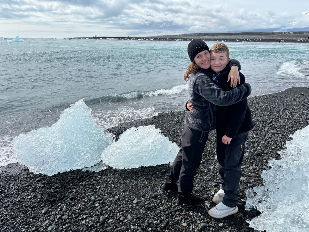 The icebergs that break out from the glacier float in the lagoon for certain time and later they are pushed by the strong glacier waters into the ocean. After that they stand next to the beach until they melt and reach a certain size to be pushed back to the beach by the waves. Beautiful!Happy boy! Next to a huge diamond!