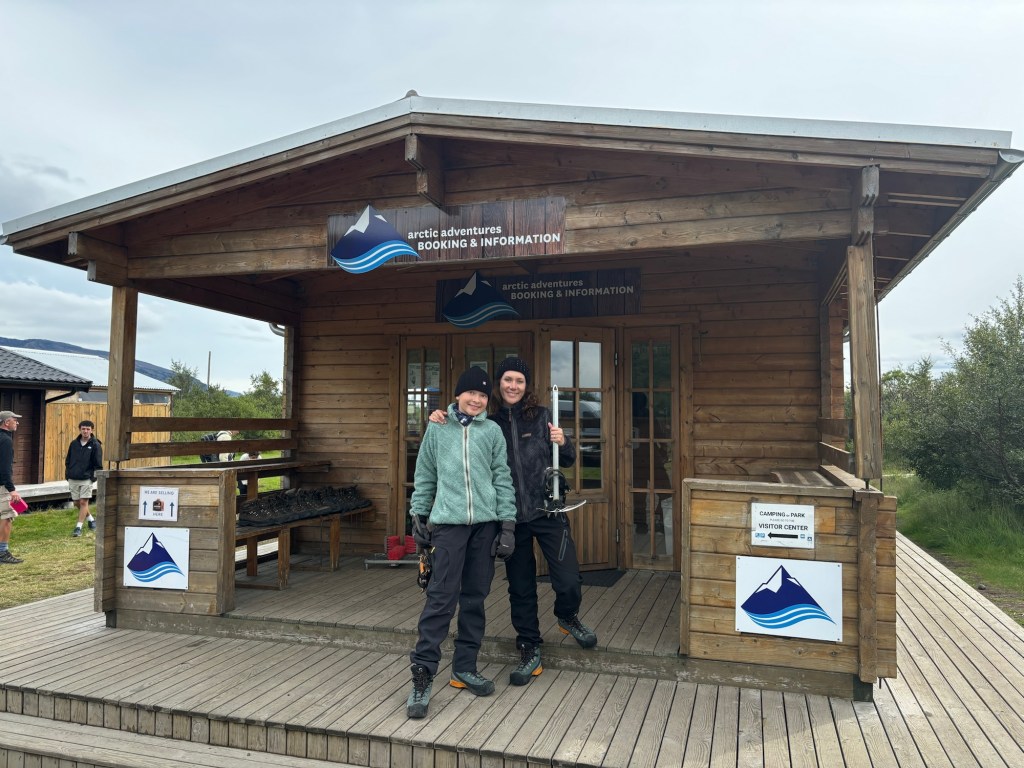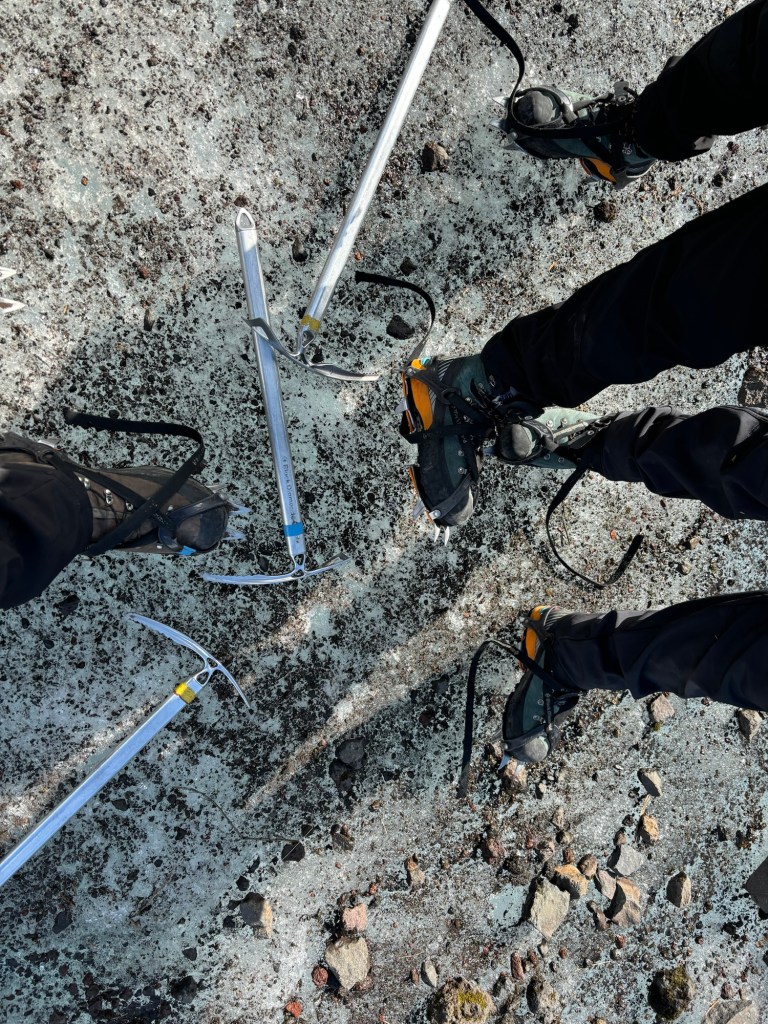 The surprise: a hike on the glacier with ice axe and cramponsThis is the glacier we will hike on!On the way to the glacier. Gabriel chatting with the guide.GearHere we are! It was a great experience, lots of fun!Beautiful teamDrinking glacier water
