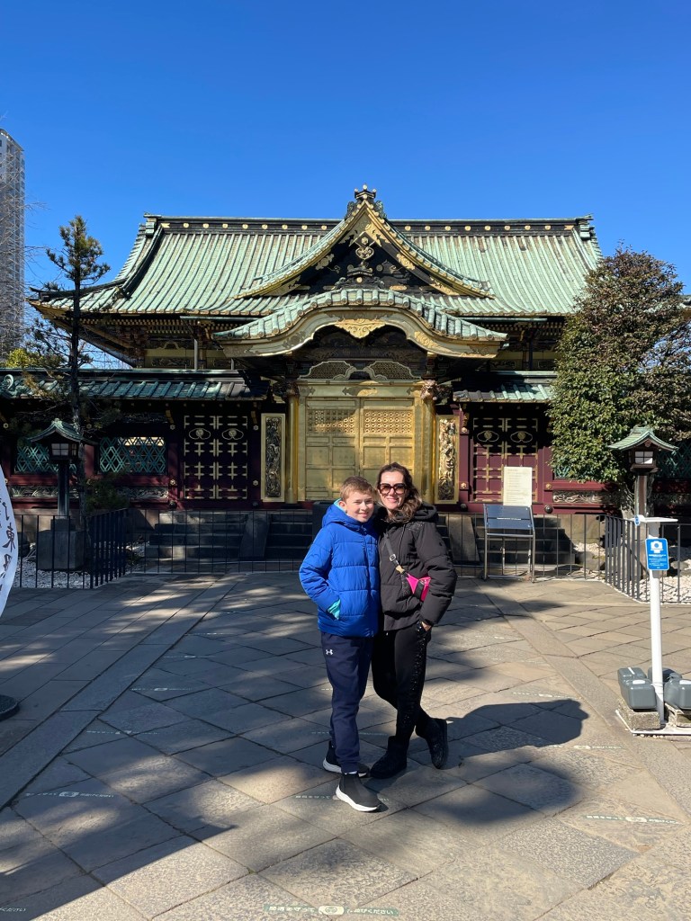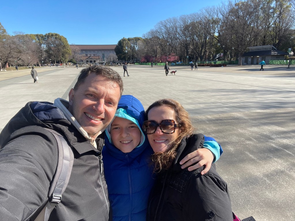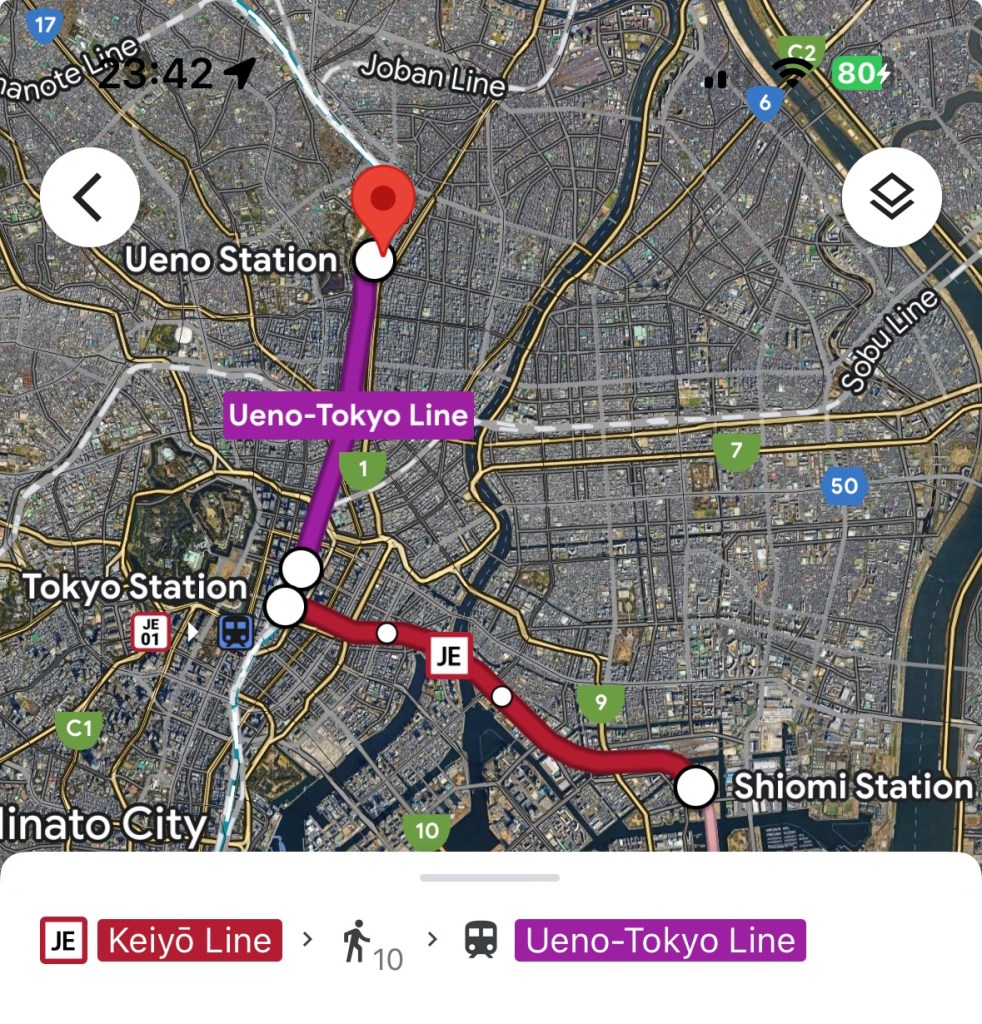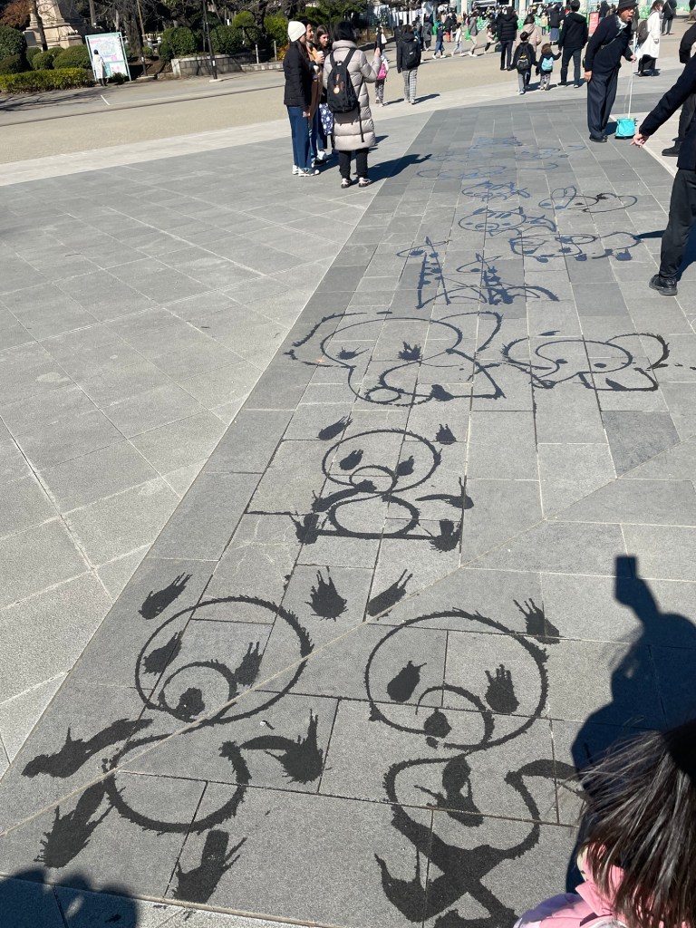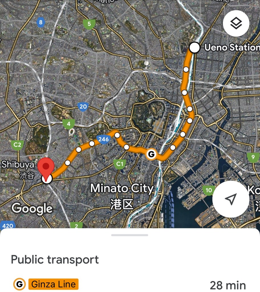 Google Maps showing all possible connections and timetables to go from A to B in Tokyo. In this case, from Shiomi Station to Ueno Station.First train station in Tokyo, next to our Hotel. Shiomi Station. Here I learned how perfect is the punctuality of Japanese trains. 😳Tokyo Station… you can not imagine how huge is this place!First stop: Ueno ParkUeno Park, a very big park that in Tokyo known for the cherry blossoms. Cherry Blossoms are called Sakura in Japanese. We came in the beginning of Spring. It was not yet the best time for cherry blossoms. We hoped to find any in Tokyo, if there was a place, it would be here.Behind us the Tokyo National Museum… we were a bit lost, not knowing in which direction to go…With a long day ahead of us, we decided to have a short breakfast to recharge the batteries! Myrna, Sofia and Alexa travelled with us this time, it was great!!! In Japan, they serve MatchaStreet artists painting pandas on the street.One of the many Pagodas next to Shrines you can find in Japan, right in the middle of Ueno Park. The 2 predominant religions in Japan are Shintoism and Buddhism. Shinto Shrines and Buddhist Temples are the places where these 2 religions are practiced. One thing we learned is that many Japanese do not chose between the one or the other, they respect and practice both!Shinto Shrine inside Ueno Park.We found cherry blossoms!They were still in the beginning of the blossom process, but it was already enough to see their beauty!
