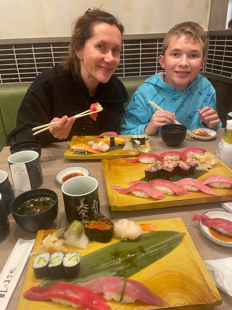 After 12h jet leg, a short breakfast, trains and lots of walking, we decided it was time for us to try some typical Japanese food… sushi!