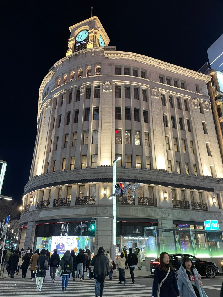 One train and then some walking, around 15min.Ginza: fancy, modern, luxury!Ginza: money is not a problem here. 😀Only very luxurious places here.Ginza: famous Seiko building.