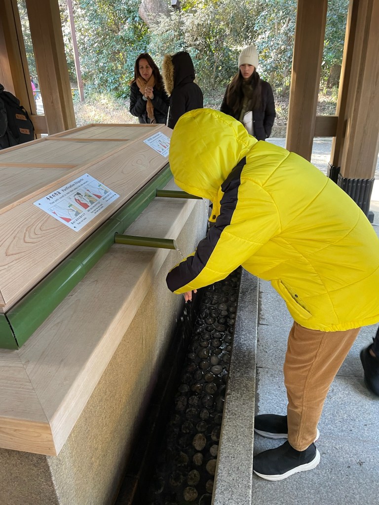 “At the entrance of Shinto shrines, visitors typically participate in a purification ritual called temizu (or chozu). This involves using water from a stone basin to cleanse the hands and mouth before entering the shrine. The ritual symbolizes spiritual purification and respect for the sacred space. To perform temizu, visitors use a ladle to pour water over their left hand, then right hand, and rinse their mouth (spitting the water out without swallowing) to prepare for prayer and worship inside the shrine.” ChatGPT.