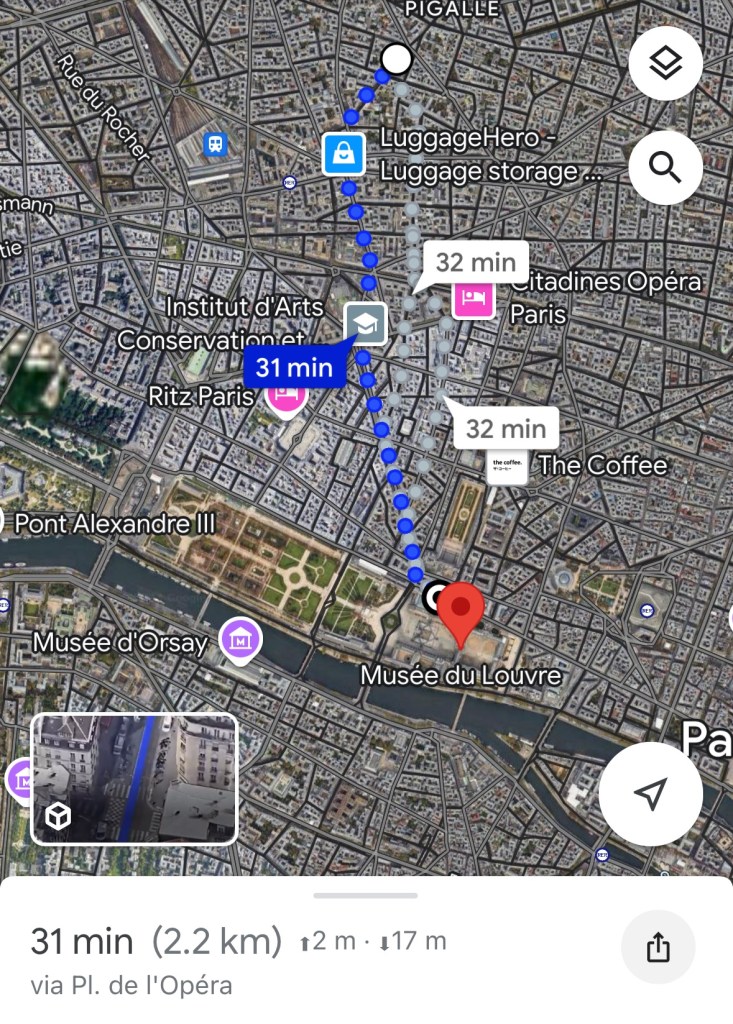 Fun fact about the Louvre: “If you were to spend just 30 seconds viewing each of the 35,000 artworks in the Louvre, it would take about 292 hours (or roughly 12 days of non-stop viewing**). This estimate doesn’t account for breaks, walking between exhibits, or additional time for larger works, so realistically, it could take much longer to see everything” ChatGPT.