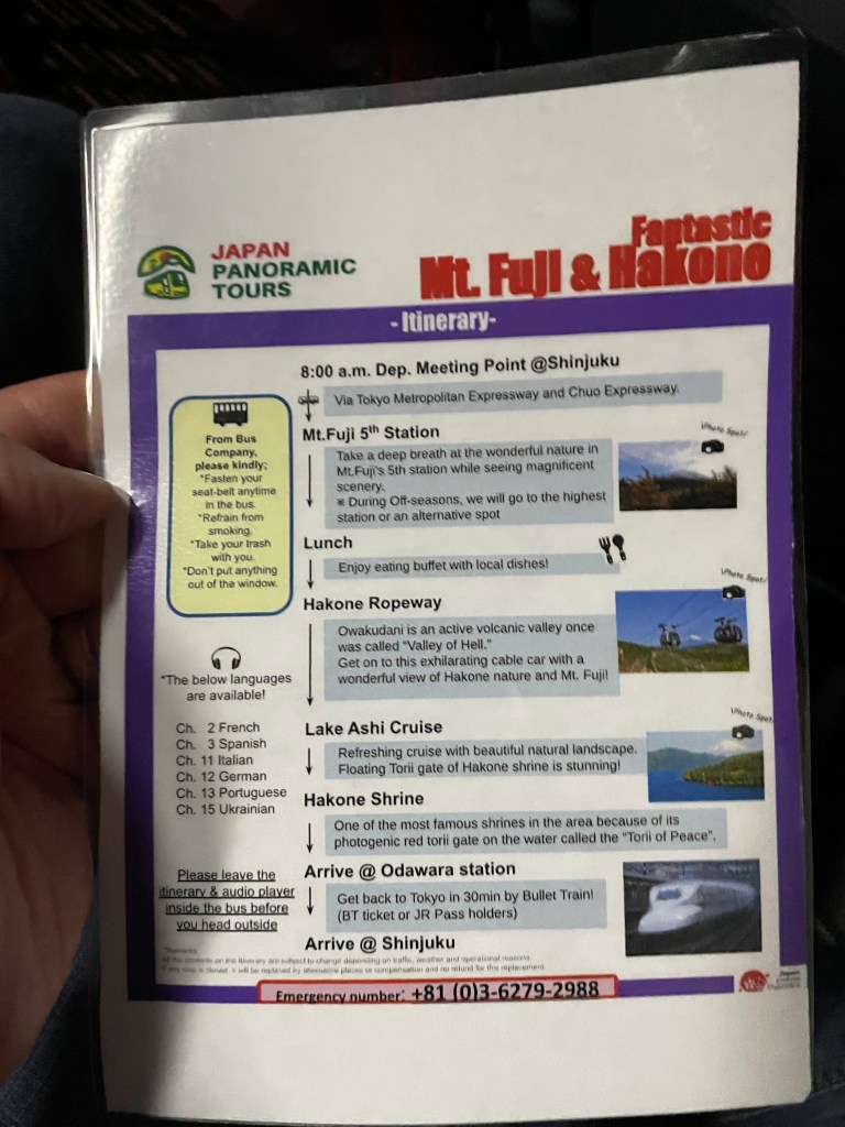Today the plan is again to have a full day guided tour. Same starting point, at the Love sculpture. Today the destination is Mt. Fuji, Cable car in Hakone and a boat trip. At the end of the day, we will return to Tokyo in the bullet Shinkansen train!!! I hope the weather will help, because it is cloudy, cold and the weather forecast warns about rain…