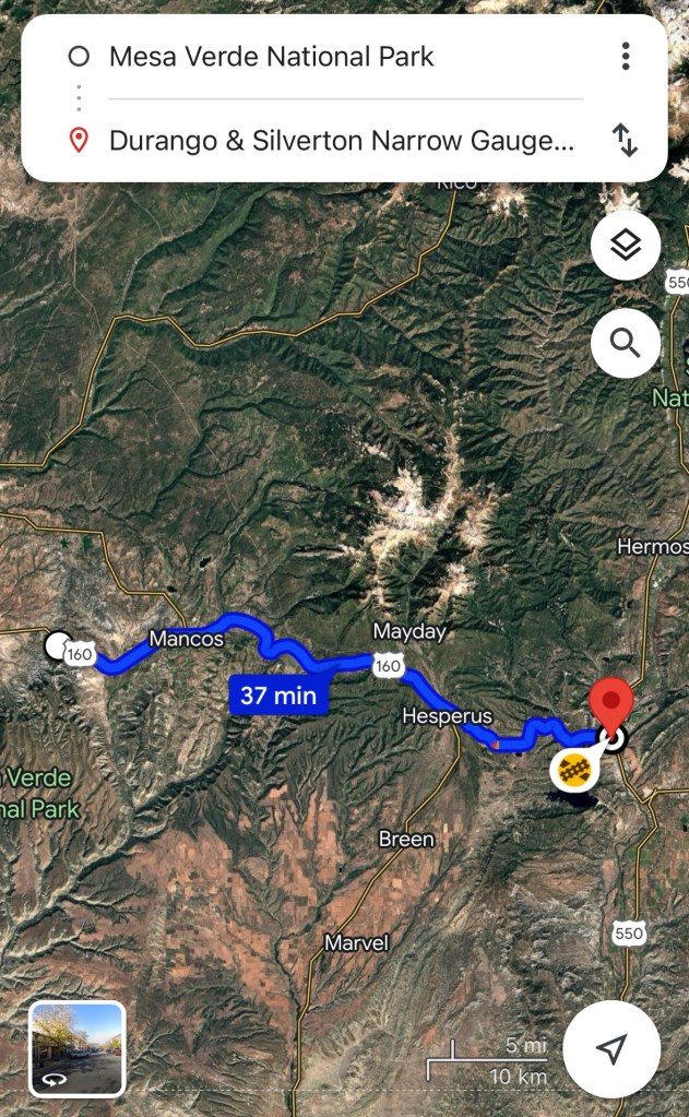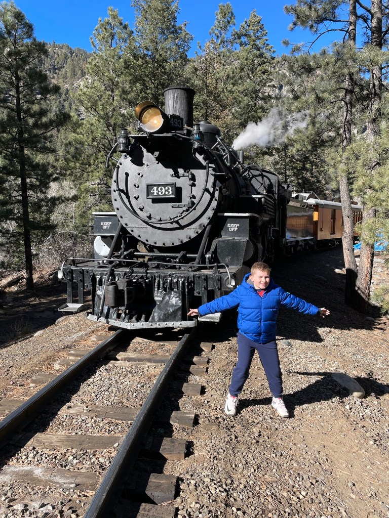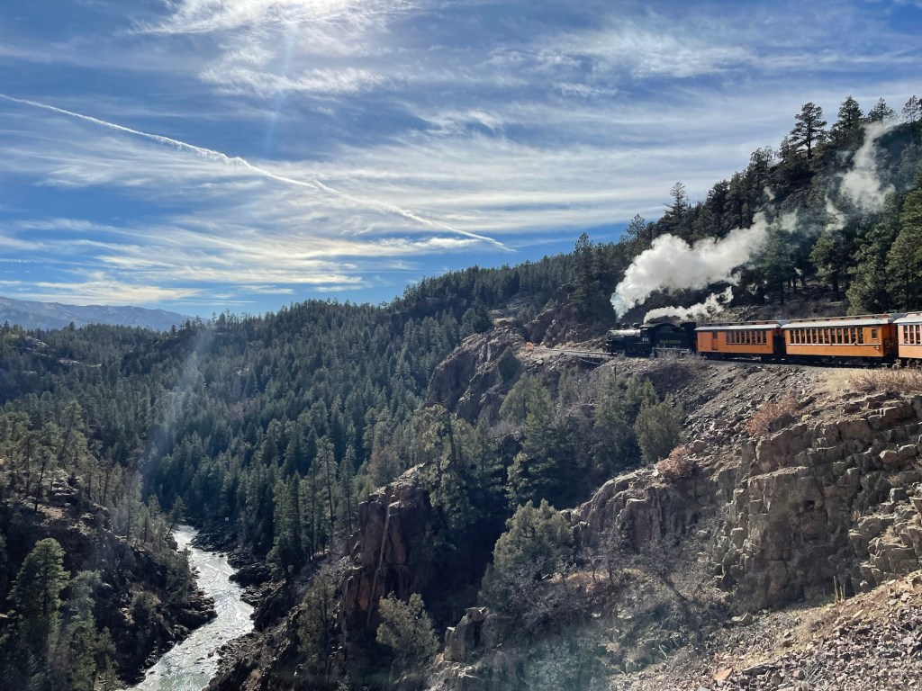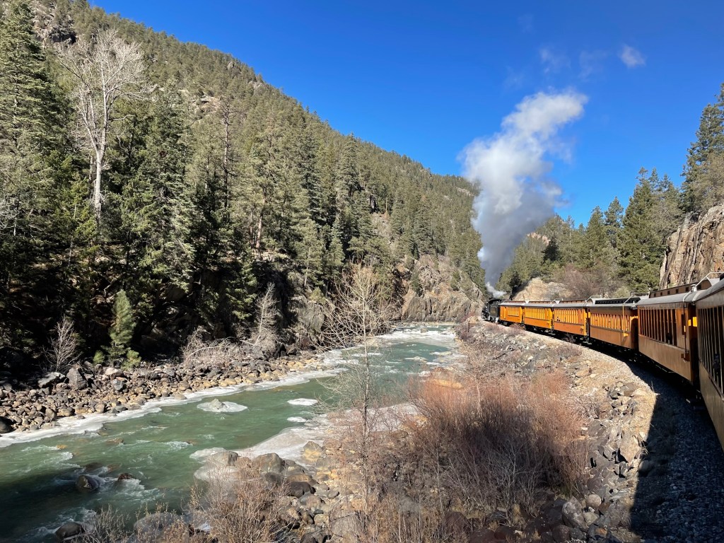 “The Durango & Silverton Narrow Gauge Railroad offers a historic train ride through Colorado’s scenic San Juan Mountains. Built in 1882, it features vintage steam locomotives traveling 45 miles between Durango and Silverton. Passengers enjoy breathtaking views of rugged peaks, forests, and rivers, making it a popular heritage and sightseeing experience.” from ChatGPT.