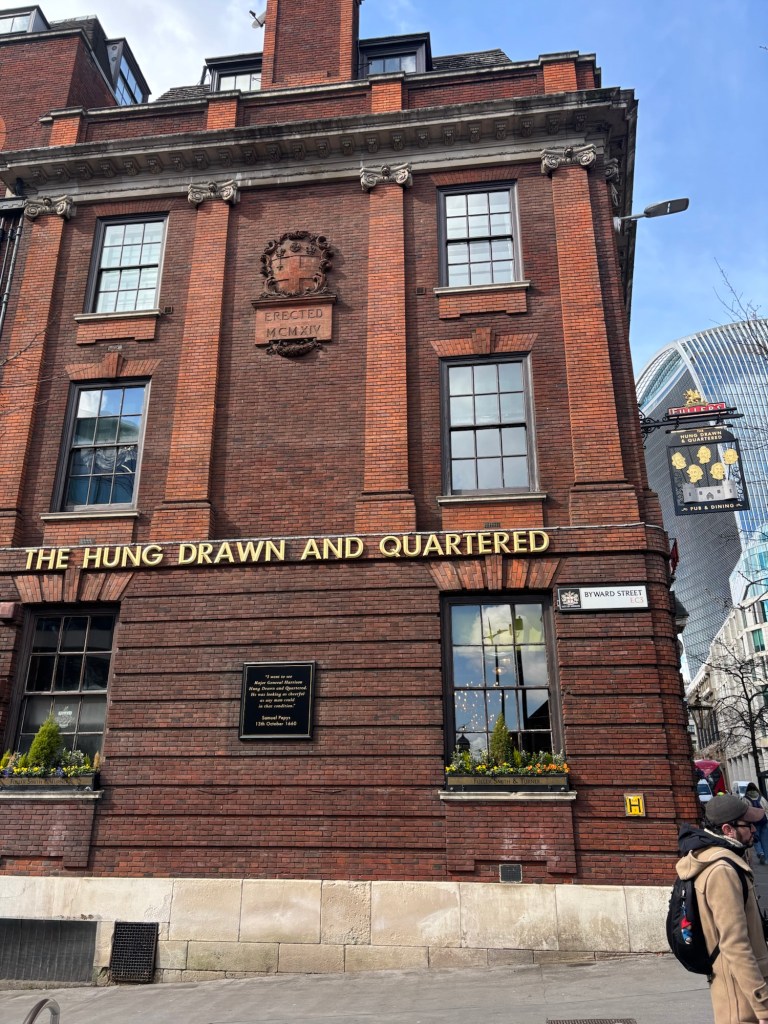Change of the guards.Look who is here.St. James’s Park in front of the palace Buckingham palace at the end of the roadLook at the name of the pub we passed by. It is located next to the place where such things used to happen hundreds of years ago, that is where the name of the pub comes from.This is the oldest church in London. It survived the big fire in 1666.Once in London, typical lunch is fish and chips! This time in front of the Tower of London.Tower of London! A fortress located at the Thames river. In the past, it used to be the largest and highest construction in London hundreds of years ago. It could be seen from any corner of London, and this was the intention from the kings at that time. It is located at the Thames because the strategic thinking was “if we control the a Thames, we control London. If we control London, we control England.”.London, a city where the old and traditional blend with the new, modern and elegant. This tall building on the background is called Shard.