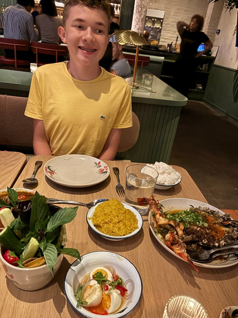 Here we are, with tio Cassiano and tia Karin!!!!! Goodbye!!! I received gifts from the local football team, the Ravens—thank you so much!!!Hotel in Philadelphia!And then we left to Philadelphia to eat at a really famous restaurant called Kalaya, here the link!!!Here is the chef, Nok Suntaranon!Look at this handmade perfection! The dumplings we had!!We later got this food! The chicken curry was spicy but everything else was really good!!Us about to eat! It was a great restaurant and later went back to our hotel! The other plate was River Prawn, Mom said they were the best prawns she ever had!